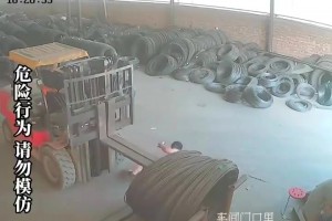 叉车正在搬运钢圈,男子低头试图钻过去结果撞到