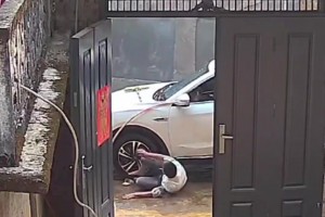 男子自己在家洗车,结果一个脚滑不慎从车上摔下