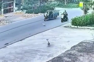 两只小动物马路上追逐,先后撞上了三轮车和电动车导致翻车