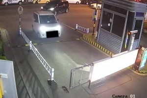 白车司机操作失误,杆子还没抬完就往前冲,结果把杆子撞坏了