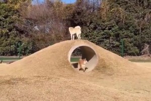 两只狗狗玩耍时卡视野,都以为自己的好朋友走丢了