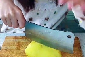 女子正在尝试切土豆丝,结果每一刀都感觉有点危险